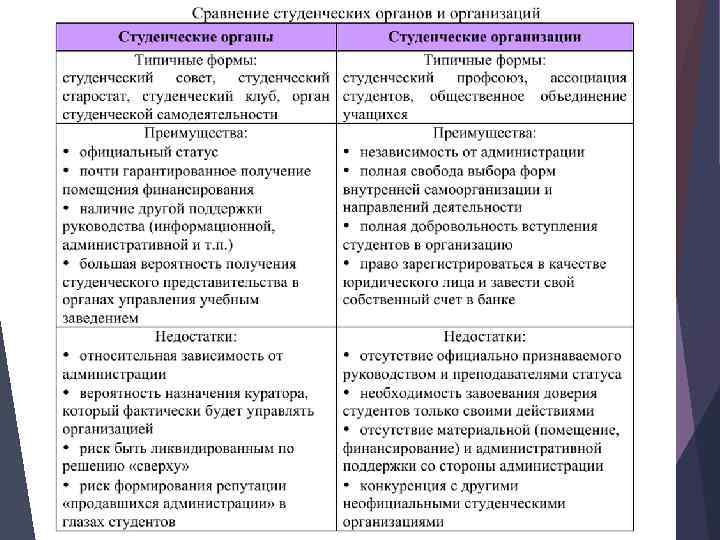 Типы и виды Еще в 2005 году на Всероссийской конференции в Екатеринбурге, посвященной студенческому самоуправлению, было отмечено невероятное многообразие форм самоорганизации студентов: • студенческие профсоюзные организации • студенческие советы (комитеты) • студенческие общественные объединения • молодежные общественные организации • союзы студентов и аспирантов • научные общества • движение студенческих отрядов • студенческие отряды охраны правопорядка • клубы по интересам • творческие объединения • студенческие советы в общежитиях и другие