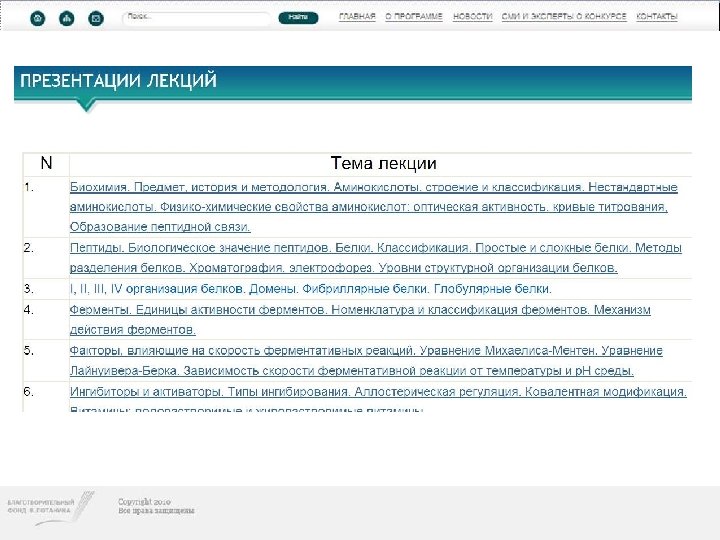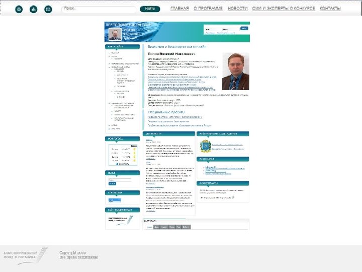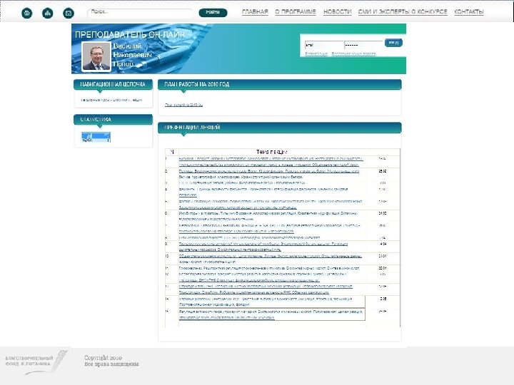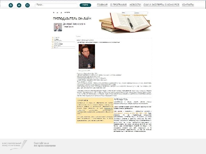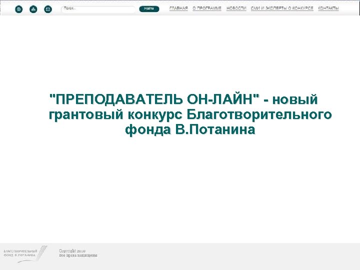 Конкурс индивидуальных грантов «ПРЕПОДАВАТЕЛЬ ОН-ЛАЙН» • В октябре 2009 года Благотворительный фонд В. Потанина открыл новую программу индивидуальных грантов «ПРЕПОДАВАТЕЛЬ ОН-ЛАЙН» . • Цель программы: поддержка индивидуальных инициатив преподавателей высших учебных заведений России, направленных на применение в учебном процессе инновационных образовательных технологий и, в частности, использование для обучения возможностей Интернета.