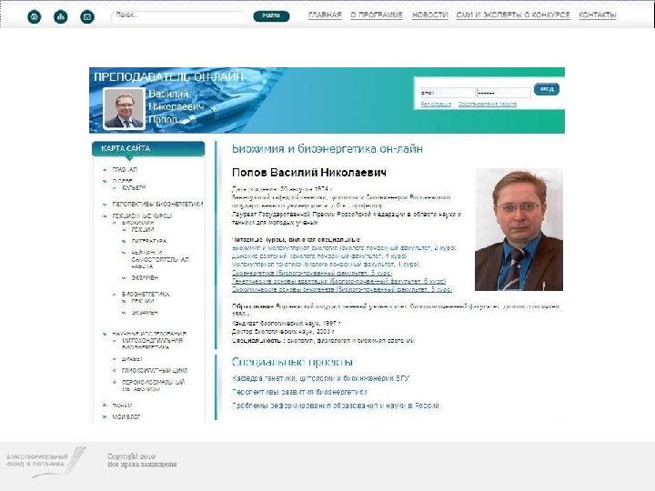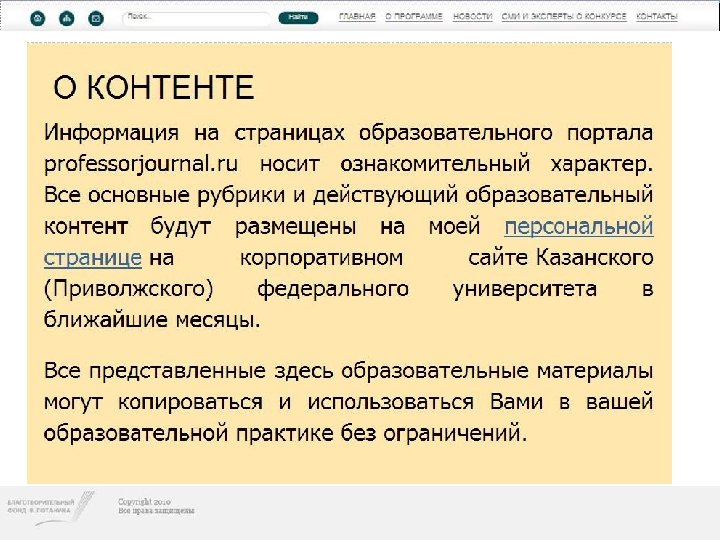 http: //www. professorjournal. ru • Professor. Journal. RU – ресурс, созданный специально для грантополучателей Благотворительного фонда В. Потанина по программе индивидуальных грантов «Преподаватель он-лайн» . На этом портале можно найти профессиональные преподавательские сайты по самым различным дисциплинам и направлениям. • Каждый сайт – это самостоятельный и целостный образовательный ресурс активно используемый в процессе преподавания в высшей школе. Для того, чтобы найти необходимую информацию, вы можете осуществить поиск через ВУЗ, ФИО преподавателя или учебную дисциплину.
