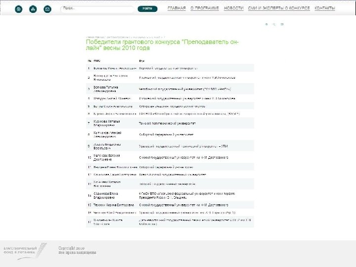 • 25 мая 2010 года Благотворительный фонд В. Потанина объявил результаты Конкурса индивидуальных грантов "ПРЕПОДАВАТЕЛЬ-ОНЛАЙН". Грантополучателями стали 34 преподавателя государственных вузов России, чьи заявки были признаны лучшими Конкурсной комиссией. • Все победители получат гранты Благотворительного фонда В. Потанина на реализацию своих "он-лайн инициатив" и принимают участие в Установочных семинарах, которые проходят два раза в год. • Всего на Конкурс было прислано более 150 заявок.