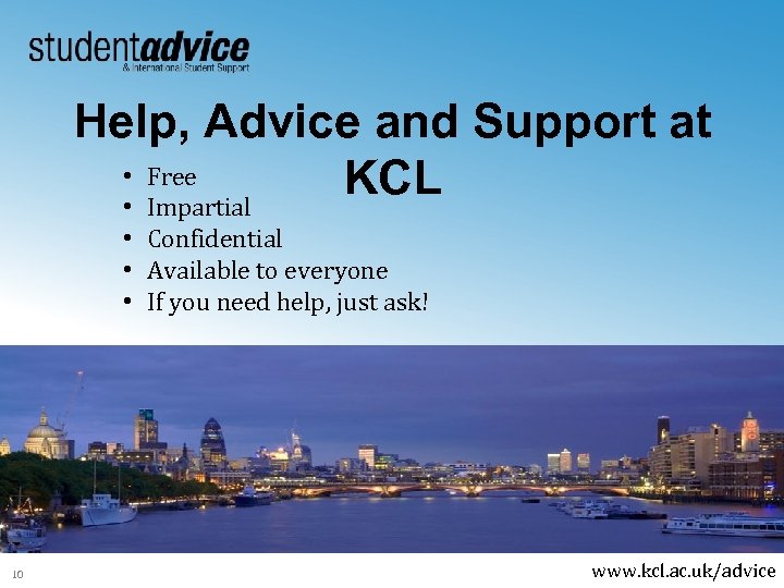 Help, Advice and Support at • Free KCL • Impartial • Confidential • Available to everyone • If you need help, just ask! 10 www. kcl. ac. uk/advice