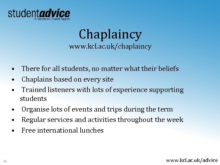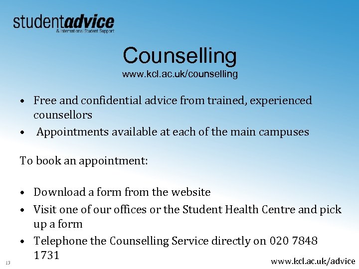 Counselling www. kcl. ac. uk/counselling • Free and confidential advice from trained, experienced counsellors • Appointments available at each of the main campuses To book an appointment: 13 • Download a form from the website • Visit one of our offices or the Student Health Centre and pick up a form • Telephone the Counselling Service directly on 020 7848 1731 www. kcl. ac. uk/advice