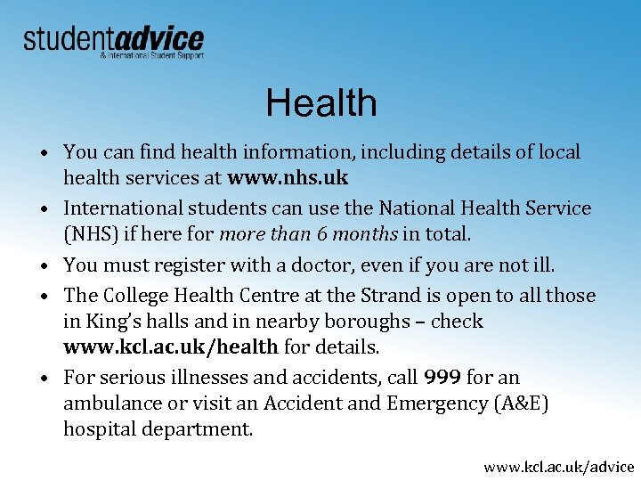 Health • You can find health information, including details of local health services at www. nhs. uk • International students can use the National Health Service (NHS) if here for more than 6 months in total. • You must register with a doctor, even if you are not ill. • The College Health Centre at the Strand is open to all those in King’s halls and in nearby boroughs – check www. kcl. ac. uk/health for details. • For serious illnesses and accidents, call 999 for an ambulance or visit an Accident and Emergency (A&E) hospital department. www. kcl. ac. uk/advice