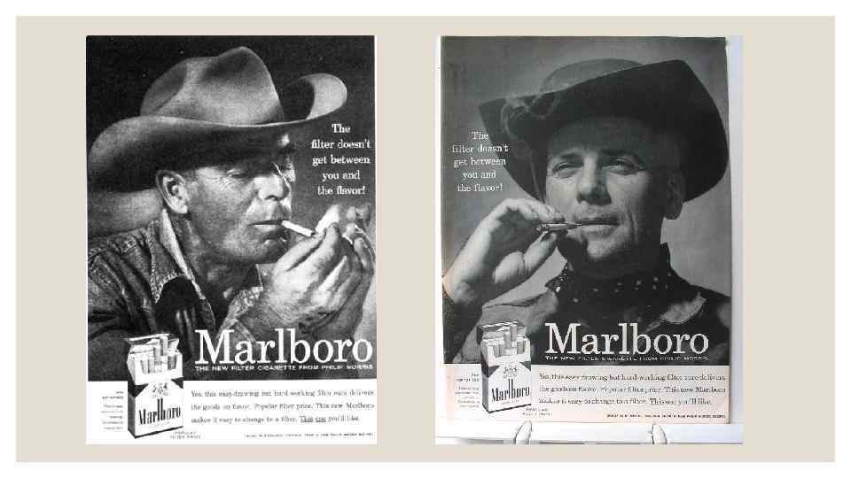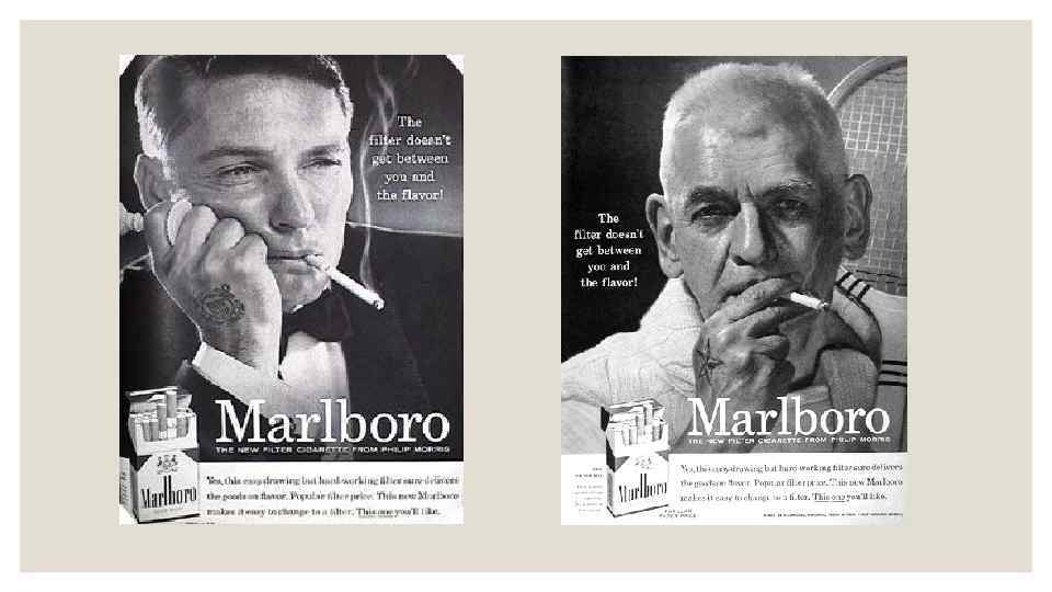 ◦ Сигарети з фільтром, якими були і Marlboro, сприймалися споживачами виключно як дамські сигарети, проте після страшного відкриття лікарів такий вид сигарет став виглядати для споживача більш безпечним. Виробники сигарет не наважувалися випустити на ринок «чоловічі» сигарети з фільтром - це здавалося однозначно провальним маркетинговим ходом. І тим не менше Філіп Морріс зважився на цей крок. За допомогою в створенні нового іміджу старому бренду Морріс звернувся до талановитого рекламіста Леонарда Бернета.
