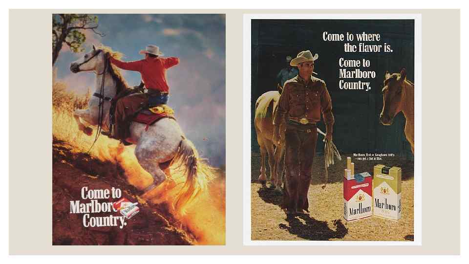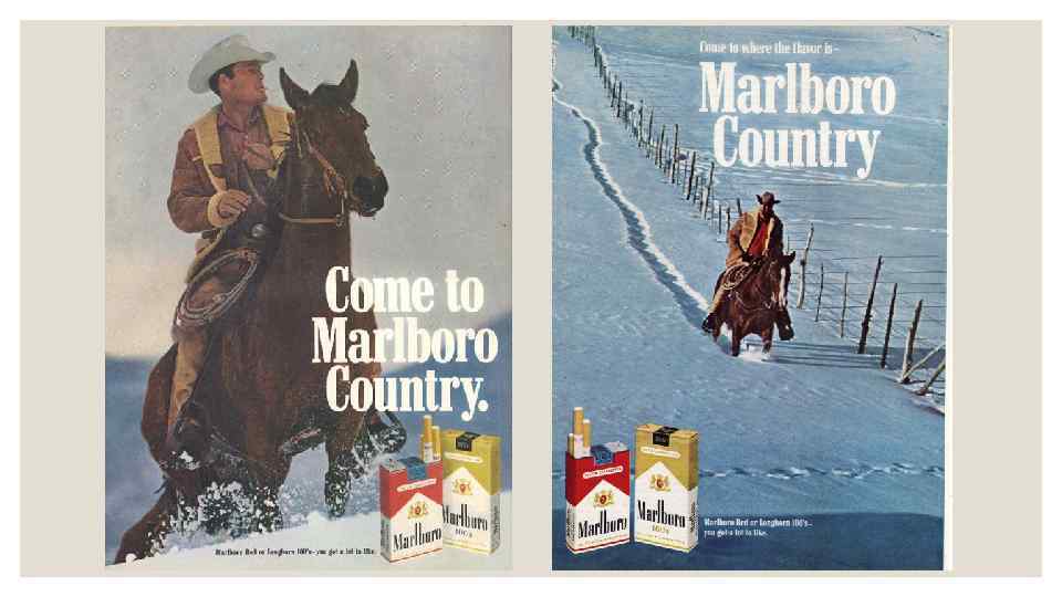 ◦ Ковбойський кампанія, в якій брали участь фотомоделі (пізніше їх замінили реальні ковбої) мала неймовірний успіх. Ковбой - втілення американського духу - зачепив споживачів за живе. Принти нагадували про справжніх героїв Америки - брутальних хлопців, що підкорюють дикі степи. Він підкорив усіх - чоловіків і жінок, чорношкірих і латиносів. Продажі Marlboro всього за один рік виросли настільки, що стали займати четверту позицію в рейтингу продажів всіх тютюнових виробів. До сих пір цю рекламну кампанію визнають однією з найбільш легендарних і сильних за всю історію реклами, а ковбой Marlboro став одним з «найвпливовіших людей, які ніколи не жили» в книзі Алана Лазара.
