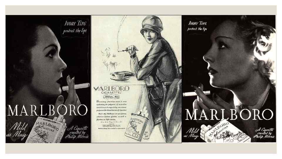 ◦ Спочатку сигарети Marlboro позиціонувалися як виключно жіночі. Але таке позиціонування з'явилося не просто так, а завдяки жіночому руху суфражизму. Суфражистки запекло боролися за надання слабкій статі виборчого права і повного рівноправ'я в цілому. «Якщо чоловіки курять сигарети - ми теж повинні мати на це право!» - приблизно з таким гаслом вони боролися за те, щоб ця шкідлива звичка була доступна і їм. Philip Morris вирішив скористатися таким шансом і зайняти ще вільну нішу жіночих сигарет, поки цього не зробив хтось інший. Назва була вибрана найбільш милозвучна - Marlborough на честь графського походження Вінстона Черчілля. Правда, для спрощеного написання «зайві» літери з слова виключили. Слоган також був орієнтований на жінок: ніжні як травень (MIld as May). Для реклами бренду була запрошена Мей Уест одна з найскандальніших актрис свого часу. На дамську аудиторію була орієнтована і упаковка: фільтр зі смужкою червоного кольору вирішував подвійне завдання: приховати неакуратний слід від помади і захистити білі зубки жінок від пожовтіння.