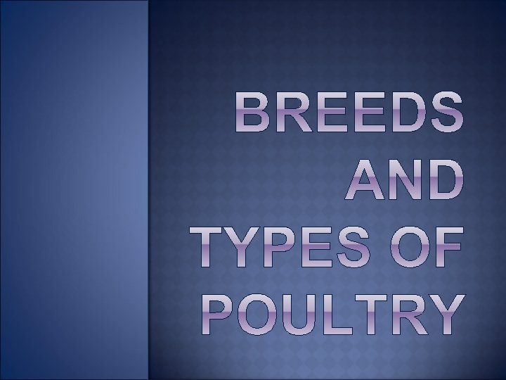 Students will: Identify major breeds of chicken and minor breeds of poultry Describe characteristics of each breed Identify breed purpose