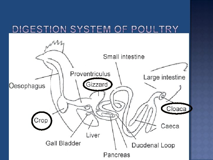 Label the major parts of poultry anatomy Explain the purpose of specific anatomical differences in digestion anatomy. Discuss the general reproductive anatomy of a hen.