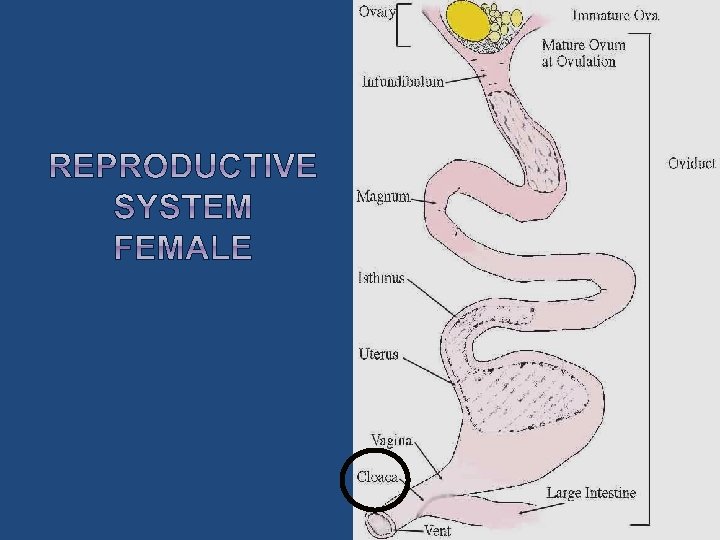 1. Ovulation- release of mature yolk from the ovary. 2. Infundibulumreceives the yolk, about 15 minutes spent.