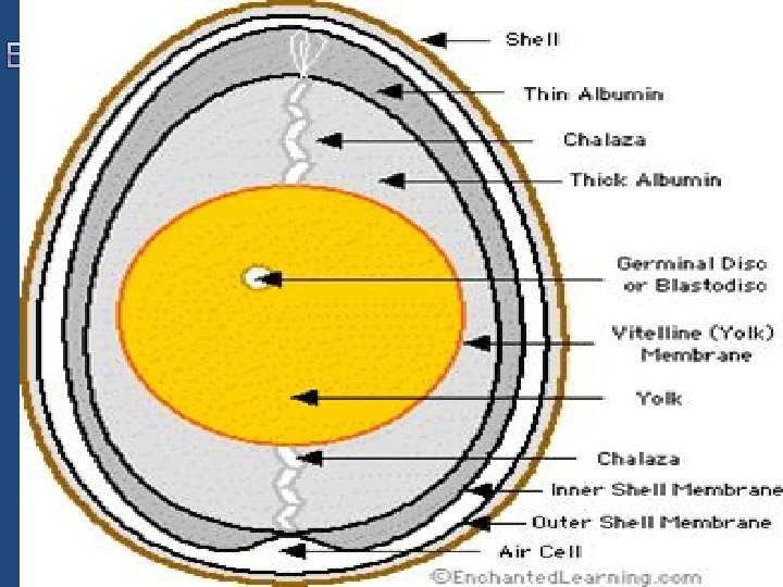 3. Air Cell- air space between two shell membranes. 4. Albumen- egg white. 5. Yolk- true egg, if fertilized become embryo.