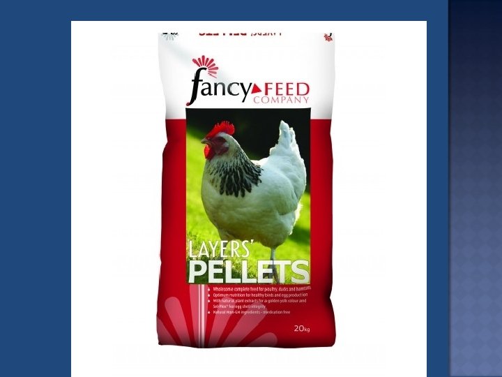 Refrigerate & keep away from onions & mold Production Goal: 4 lbs feed / dozen eggs Hens produce 7 eggs / 10 days