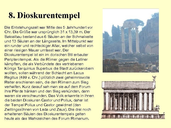 8. Dioskurentempel Die Entstehungszeit war Mitte des 5 Jahrhundert vor Chr. Die Größe war ursprünglich 31 x 13, 39 m. Der Sakralbau bestand aus 6 Säulen an der Schmalseite und 13 Säulen an der Längsseite. Im Mittelpunkt war ein runder und rechteckiger Altar, welcher selbst von einer riesigen Mauer umfasst war. Der Dioskurentempel ist ein im dorischen Stil erbauter Peripterotempel. Als die Römer gegen die Latiner kämpften, die als Verbündete des vertriebenen Königs Tarquinius Superbus die Stadt zurückerobern wollten, sollen während der Schlacht am Lacus Regillus (499 v. Chr. ) plötzlich zwei geheimnisvolle Reiter erschienen sein, die den Römern zum Sieg verhalfen. Kurz darauf sah man sie auf dem Forum ihre Pferde tränken und den Sieg verkünden, dann waren sie verschwunden. Das Volk erkannte in ihnen die beiden Dioskuren Castor und Pollux, daher ist der Tempel Pollux und Castor gewidmet (den Zwillingssöhnen von Leda und Zeus). Die drei noch erhaltenen Säulen des Dioskurentempels gelten heute als das Wahrzeichen des Forum Romanum.