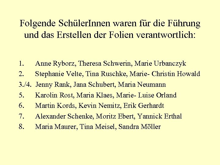 Folgende Schüler. Innen waren für die Führung und das Erstellen der Folien verantwortlich: 1. 2. 3. /4. 5. 6. 7. 8. Anne Ryborz, Theresa Schwerin, Marie Urbanczyk Stephanie Velte, Tina Ruschke, Marie- Christin Howald Jenny Rank, Jana Schubert, Maria Neumann Karolin Rost, Maria Klaes, Marie- Luise Orland Martin Kords, Kevin Nemitz, Erik Gerhardt Alexander Schenke, Moritz Ebert, Yannick Erthal Maria Maurer, Tina Meisel, Sandra Möller