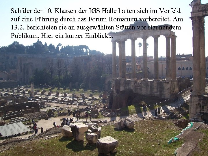 Schüler der 10. Klassen der IGS Halle hatten sich im Vorfeld auf eine Führung durch das Forum Romanum vorbereitet. Am 13. 2. berichteten sie an ausgewählten Stätten vor staunendem Publikum. Hier ein kurzer Einblick. . .