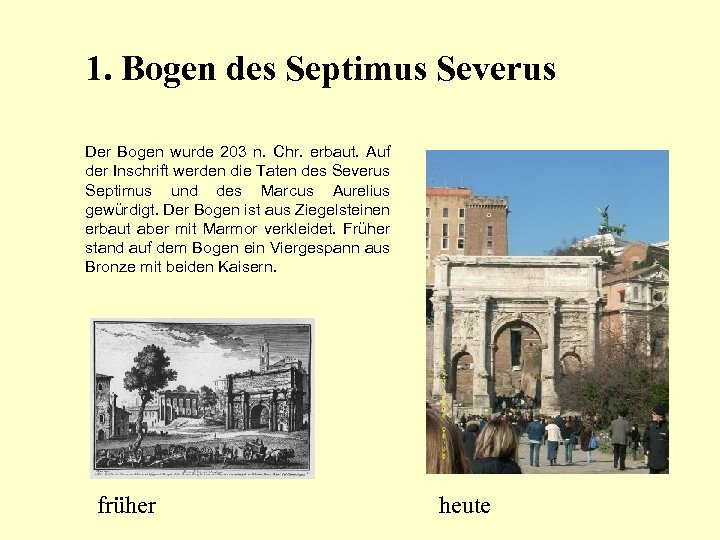1. Bogen des Septimus Severus Der Bogen wurde 203 n. Chr. erbaut. Auf der Inschrift werden die Taten des Severus Septimus und des Marcus Aurelius gewürdigt. Der Bogen ist aus Ziegelsteinen erbaut aber mit Marmor verkleidet. Früher stand auf dem Bogen ein Viergespann aus Bronze mit beiden Kaisern. früher heute