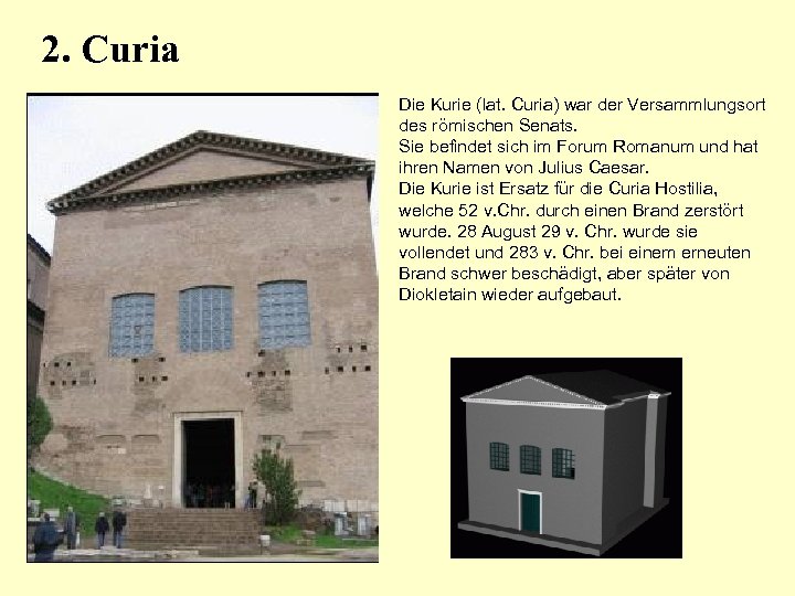 2. Curia Die Kurie (lat. Curia) war der Versammlungsort des römischen Senats. Sie befindet sich im Forum Romanum und hat ihren Namen von Julius Caesar. Die Kurie ist Ersatz für die Curia Hostilia, welche 52 v. Chr. durch einen Brand zerstört wurde. 28 August 29 v. Chr. wurde sie vollendet und 283 v. Chr. bei einem erneuten Brand schwer beschädigt, aber später von Diokletain wieder aufgebaut.