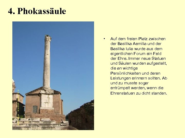 4. Phokassäule • Auf dem freien Platz zwischen der Basilika Aemilia und der Basilika lulia wurde aus dem eigentlichen Forum ein Feld der Ehre. Immer neue Statuen und Säulen wurden aufgestellt, die an wichtige Persönlichkeiten und deren Leistungen erinnern sollten. Ab und zu musste sogar entrümpelt werden, wenn die Ehrenstatuen zu dicht standen.