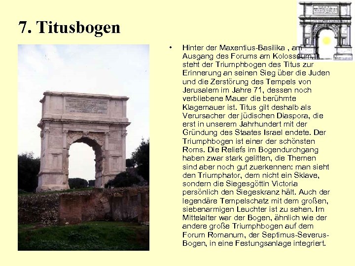 7. Titusbogen • Hinter der Maxentius-Basilika , am Ausgang des Forums am Kolosseum, steht der Triumphbogen des Titus zur Erinnerung an seinen Sieg über die Juden und die Zerstörung des Tempels von Jerusalem im Jahre 71, dessen noch verbliebene Mauer die berühmte Klagemauer ist. Titus gilt deshalb als Verursacher der jüdischen Diaspora, die erst in unserem Jahrhundert mit der Gründung des Staates Israel endete. Der Triumphbogen ist einer der schönsten Roms. Die Reliefs im Bogendurchgang haben zwar stark gelitten, die Themen sind aber noch gut zuerkennen: man sieht den Triumphator, dem nicht ein Sklave, sondern die Siegesgöttin Victoria persönlich den Siegeskranz hält. Auch der legendäre Tempelschatz mit dem großen, siebenarmigen Leuchter ist zu sehen. Im Mittelalter war der Bogen, ähnlich wie der andere große Triumphbogen auf dem Forum Romanum, der Septimus-Severus- Bogen, in eine Festungsanlage integriert.