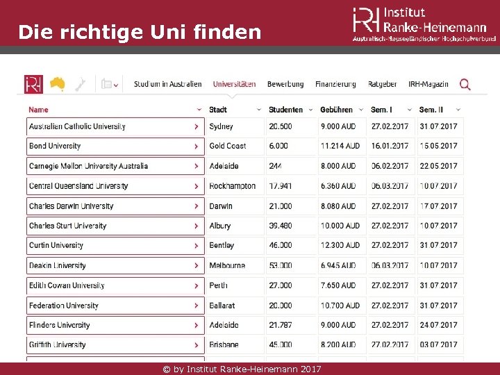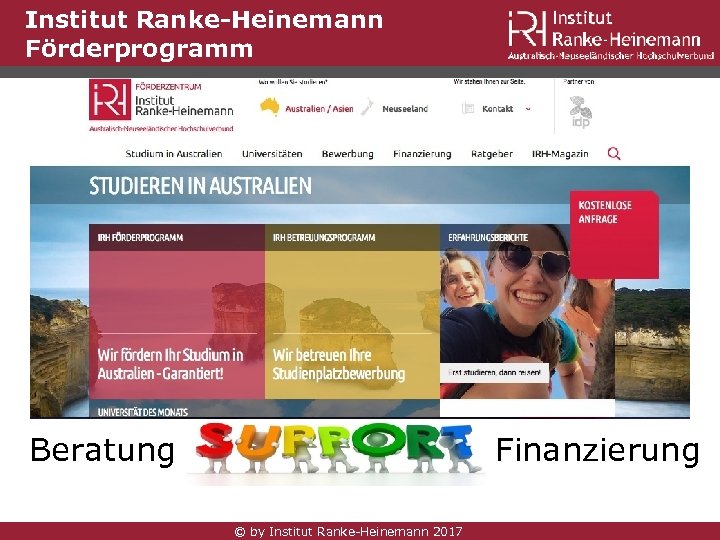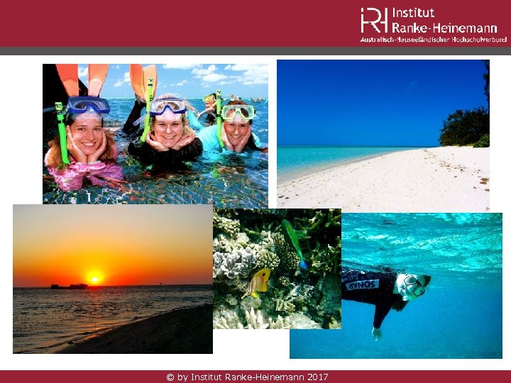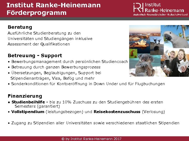 Institut Ranke-Heinemann Förderprogramm Beratung Ausführliche Studienberatung zu den Universitäten und Studiengängen inklusive Assessment der Qualifikationen Betreuung - Support • Bewerbungsmanagement durch persönlichen Studiencoach • Betreuung durch ganzen Bewerbungsprozess • Übersetzungen, Beglaubigungen, Support bei Stipendienanträgen, Visa, Bafög und mehr • Sonderkonditionen für Kontoeröffnung in Down Under und für Flugbuchungen Finanzierung • Studienbeihilfe - bis zu 10% Zuschuss zu den Studiengebühren des ersten Semesters (garantiert) • Vollstipendium (leistungsbezogen) und Reisekostenzuschuss (Verlosung) • Zugang zu Stipendien aller Universitäten sowie verschiedenen staatlichen Stipendien © by Institut Ranke-Heinemann 2017