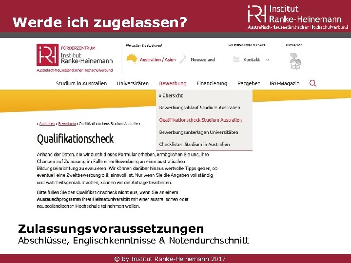 Werde ich zugelassen? ? Zulassungsvoraussetzungen Abschlüsse, Englischkenntnisse & Notendurchschnitt © by Institut Ranke-Heinemann 2017