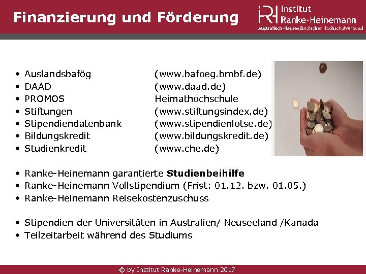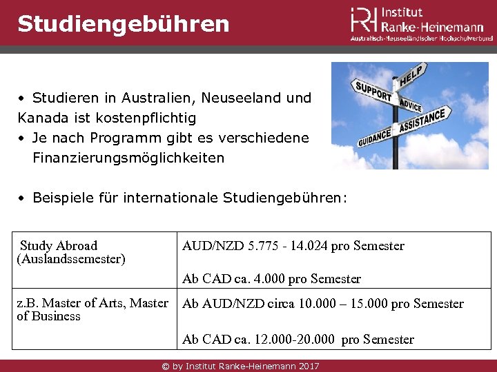 Studiengebühren • Studieren in Australien, Neuseeland und Kanada ist kostenpflichtig • Je nach Programm gibt es verschiedene Finanzierungsmöglichkeiten • Beispiele für internationale Studiengebühren: Study Abroad (Auslandssemester) AUD/NZD 5. 775 - 14. 024 pro Semester Ab CAD ca. 4. 000 pro Semester z. B. Master of Arts, Master of Business Ab AUD/NZD circa 10. 000 – 15. 000 pro Semester Ab CAD ca. 12. 000 -20. 000 pro Semester © by Institut Ranke-Heinemann 2017