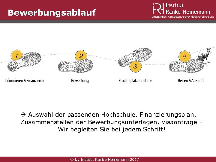 Bewerbungsablauf Auswahl der passenden Hochschule, Finanzierungsplan, Zusammenstellen der Bewerbungsunterlagen, Visaanträge – Wir begleiten Sie bei jedem Schritt! © by Institut Ranke-Heinemann 2017