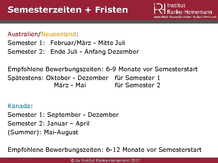 Semesterzeiten + Fristen Australien/Neuseeland: Semester 1: Februar/März - Mitte Juli Semester 2: Ende Juli - Anfang Dezember Empfohlene Bewerbungszeiten: 6 -9 Monate vor Semesterstart Spätestens: Oktober - Dezember für Semester 1 März - Mai für Semester 2 Kanada: Semester 1: September - Dezember Semester 2: Januar – April (Summer): Mai-August Empfohlene Bewerbungszeiten: 6 -12 Monate vor Semesterstart © by Institut Ranke-Heinemann 2017