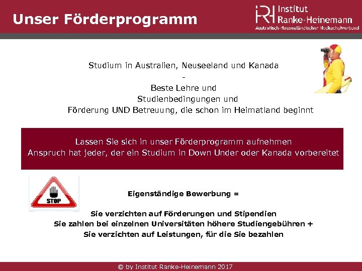 Unser Förderprogramm Studium in Australien, Neuseeland und Kanada Beste Lehre und Studienbedingungen und Förderung UND Betreuung, die schon im Heimatland beginnt Lassen Sie sich in unser Förderprogramm aufnehmen Anspruch hat jeder, der ein Studium in Down Under oder Kanada vorbereitet Eigenständige Bewerbung = Sie verzichten auf Förderungen und Stipendien Sie zahlen bei einzelnen Universitäten höhere Studiengebühren + Sie verzichten auf Leistungen, für die Sie bezahlen © by Institut Ranke-Heinemann 2017