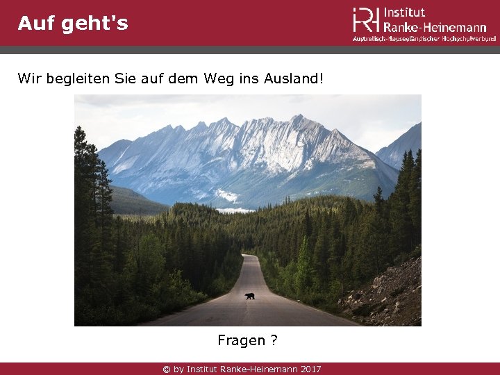 Auf geht's Wir begleiten Sie auf dem Weg ins Ausland! Fragen ? © by Institut Ranke-Heinemann 2017