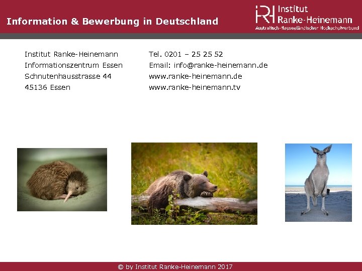 Information & Bewerbung in Deutschland Institut Ranke-Heinemann Tel. 0201 – 25 25 52 Informationszentrum Essen Email: info@ranke-heinemann. de Schnutenhausstrasse 44 www. ranke-heinemann. de 45136 Essen www. ranke-heinemann. tv © by Institut Ranke-Heinemann 2017