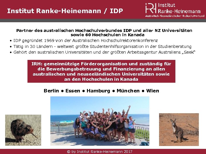 Institut Ranke-Heinemann / IDP Partner des australischen Hochschulverbundes IDP und aller NZ Universitäten sowie 60 Hochschulen in Kanada • IDP gegründet 1969 von der Australischen Hochschulrektorenkonferenz • Tätig in 30 Ländern - weltweit größte Studentenhilfsorganisation in der Studienberatung • Gehört den australischen Universitäten und der größten Arbeitsagentur Australiens „Seek“ IRH: gemeinnützige Förderorganisation und zuständig für die Bewerbungsbetreuung und Finanzierung an allen australischen und neuseeländischen Universitäten sowie an den Hochschulen in Kanada Berlin • Essen • Hamburg • München • Wien © by Institut Ranke-Heinemann 2017