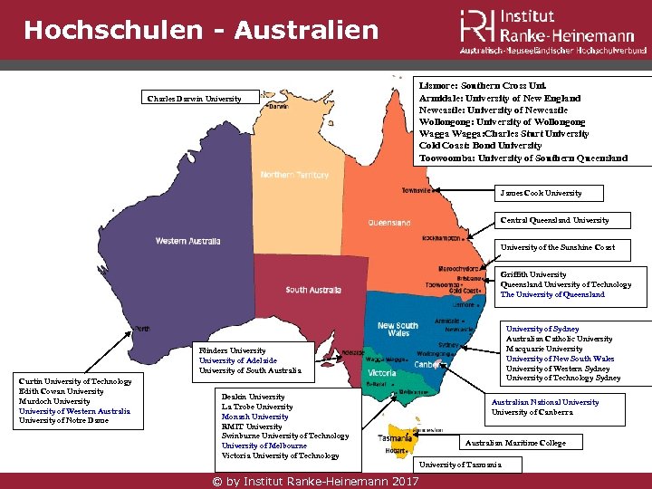 Hochschulen - Australien Charles Darwin University Lismore: Southern Cross Uni. Armidale: University of New England Newcastle: University of Newcastle Wollongong: University of Wollongong Wagga: Charles Sturt University Cold Coast: Bond University Toowoomba: University of Southern Queensland James Cook University Central Queensland University of the Sunshine Coast Griffith University Queensland University of Technology The University of Queensland University of Sydney Australian Catholic University Macquarie University of New South Wales University of Western Sydney University of Technology Sydney Flinders University of Adelaide University of South Australia Curtin University of Technology Edith Cowan University Murdoch University of Western Australia University of Notre Dame Deakin University La Trobe University Monash University RMIT University Swinburne University of Technology University of Melbourne Victoria University of Technology Australian National University of Canberra Australian Maritime College University of Tasmania © by Institut Ranke-Heinemann 2017