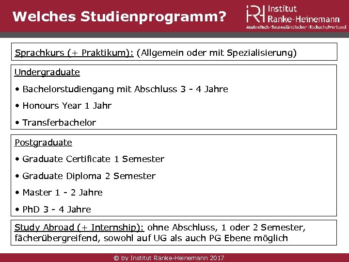 Welches Studienprogramm? Sprachkurs (+ Praktikum): (Allgemein oder mit Spezialisierung) Undergraduate • Bachelorstudiengang mit Abschluss 3 - 4 Jahre • Honours Year 1 Jahr • Transferbachelor Postgraduate • Graduate Certificate 1 Semester • Graduate Diploma 2 Semester • Master 1 - 2 Jahre • Ph. D 3 - 4 Jahre Study Abroad (+ Internship): ohne Abschluss, 1 oder 2 Semester, fächerübergreifend, sowohl auf UG als auch PG Ebene möglich © by Institut Ranke-Heinemann 2017
