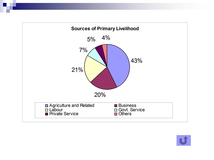 Impact on Income Primary Livelihood Numbers of households % Households who use Electricity for Livelihood % Number of households who have confirmed Households increased in who reported income as an increase in percentage of income by all households way of using electricity for livelihood Agriculture and Related 407 42. 75 76 7. 98 71 43. 83 Business 193 20. 27 64 6. 72 60 37. 04 Labour 195 20. 48 14 1. 47 11 6. 79 Govt. Service 71 7. 46 2 0. 21 0 0 Private Service 50 5. 25 3 0. 32 2 1. 23 Others 35 3. 68 3 0. 32 2 1. 23 Total 952 100 162 17. 02 146 90. 12