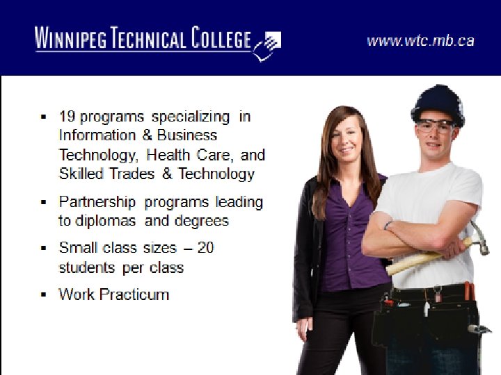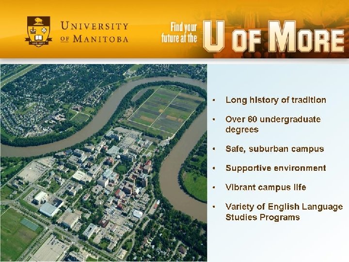 EDUCATION IN MANITOBA High priority for government funding with emphasis on accessibility Smaller class sizes with student-centered teaching focused on creativity and problem-solving Complete range of program options from short-term study to Ph. Ds A variety of accommodation options including Homestays, student residences, and private arrangements Many options for extracurricular and free-time activities Free Provincial Healthcare (effective April 1, 2012) Welcoming Quality Choice Opportunity
