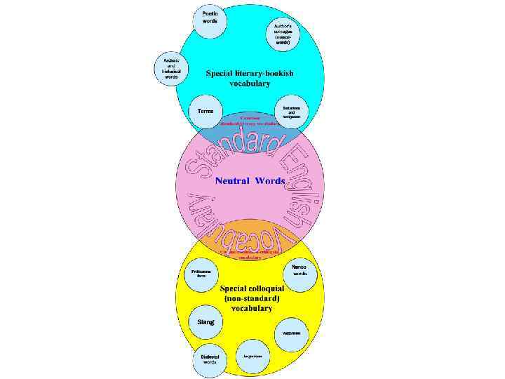 l The English vocabulary, its main layers, their aspects. l The standard English vocabulary. Neutral words l Literary vocabulary, its constituent parts. l Colloquial vocabulary, its constituent parts.