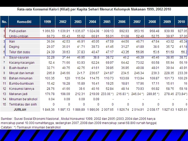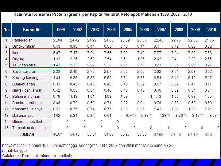 Keragaman pangan 1. Ketersedian pangan Indonesia telah melebihi kebutuhan yakni sebesar 3031 kilo kalori (standar 2200) dan protein 76, 28 gram per kapita per hari (standar 54 gram) 2. Konsumsi beras masih cukup tinggi yaitu sebesar 105, 2 kg/kap/thn (Susenas 2005). Namun konsumsi pangan sumber protein, sumber lemak dan vitamin/mineral masih jauh dari harapan. 3. Konsumsi terigu cenderung mengalami peningkatan dg bermunculannya produk 2 olahan terigu: mie, roti