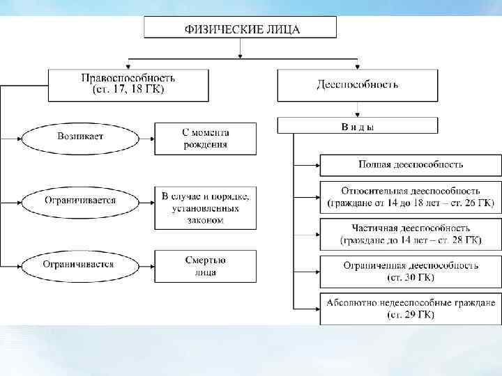 Дееспособность физических лиц Наступает с определенного возраста (полная – с 18 лет) Зависит от вменяемости человека Может быть ограничена судом по состоянию здоровья, если человек своими действиями наносит ущерб себе или своим близким