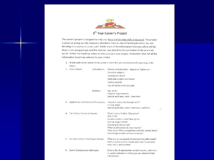Senior Cycle Guidance 1 Class per week in 5 th Year n 1 Class per week in 6 th Year n Individual Career Counselling (on request) n Computer Room Access - On-line Applications n