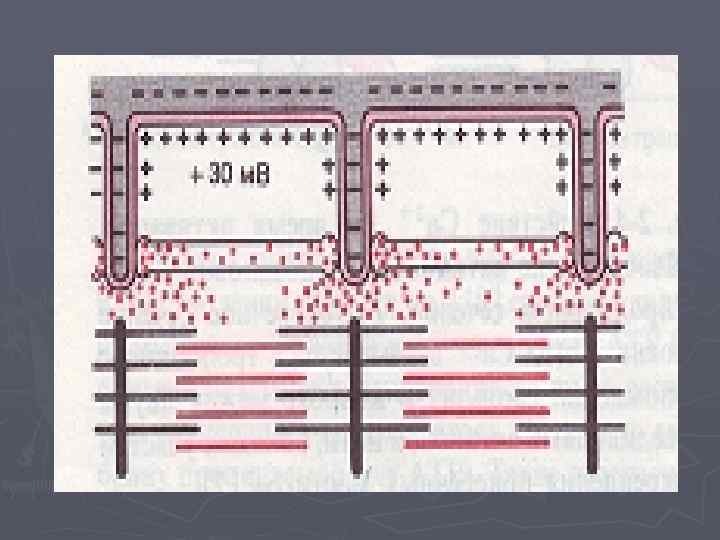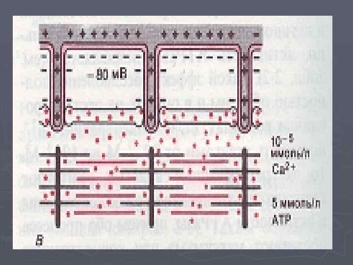 ►Starts the mechanism of muscular reduction of PD which reaching cross tubules captures lateral tanks which leave calcium ions in саркоплазму. ►Ions of calcium work on troponin which is deformed and immerses тропомиозин in a fillet between chains aktin, opening active sites for an attachment of a head of a miozinovy thread.