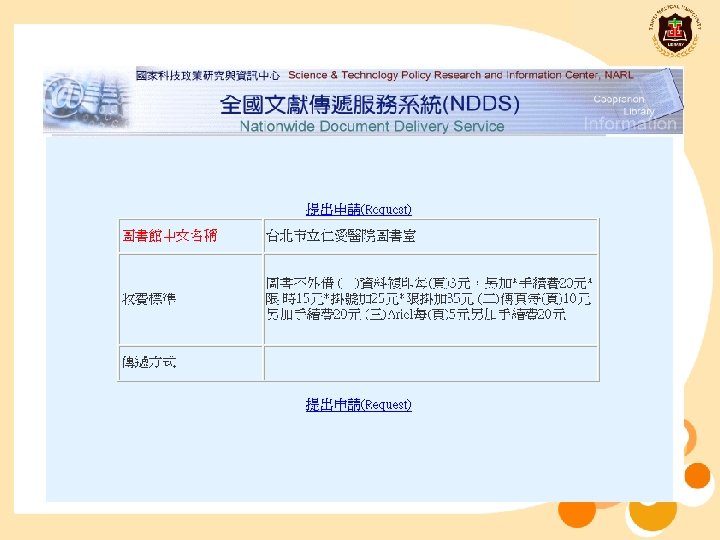 obtain reference bibliography by database index (ex:Medline、Pub. Med) NDDS http: //ndds. stpi. org. tw/ Apply Taiwan or foreign document delivery service ( pay) TMU library →e-resource http: //diglib. tmu. edu. tw/er 2/ Click the English letters. Click quick search and key in name of journal. Find the journal and obtain full text. Holding library Can’t find holding library Union List of Serials http: //ndds. stpi. org. tw →click d Union List of Serials→ key in name of journal /ISSN Can’t find the journal Find the journal and obtain full text. Can’t find the journal nor obtain full text. ELIS system→choose title→key in name of journalhttp: //elis. tm u. edu. tw: 2082/