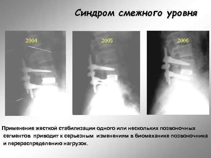 Синдром смежного уровня 2004 2005 2006 Применение жесткой стабилизации одного или нескольких позвоночных сегментов приводит к серьезным изменениям в биомеханике позвоночника и перераспределению нагрузок