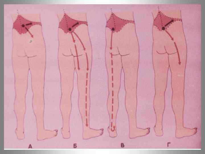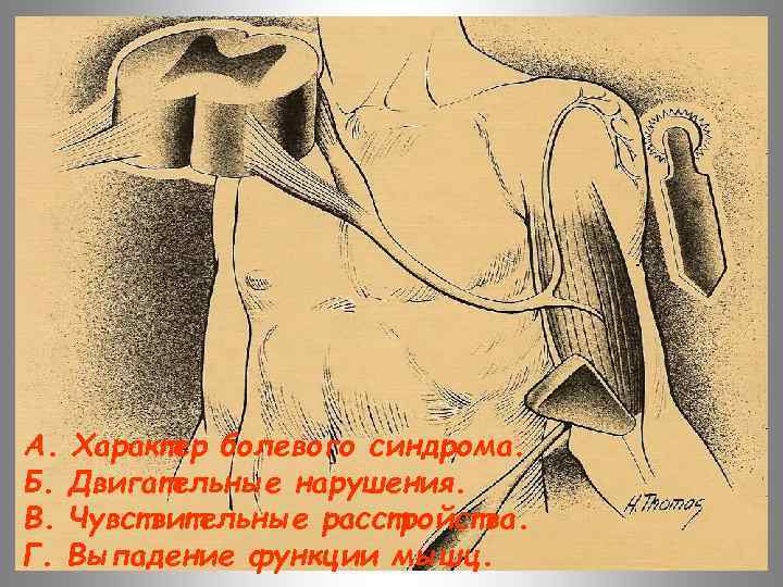 А. Характер болевого синдрома. Б. Двигательные нарушения. В. Чувствительные расстройства. Г. Выпадение функции мышц.