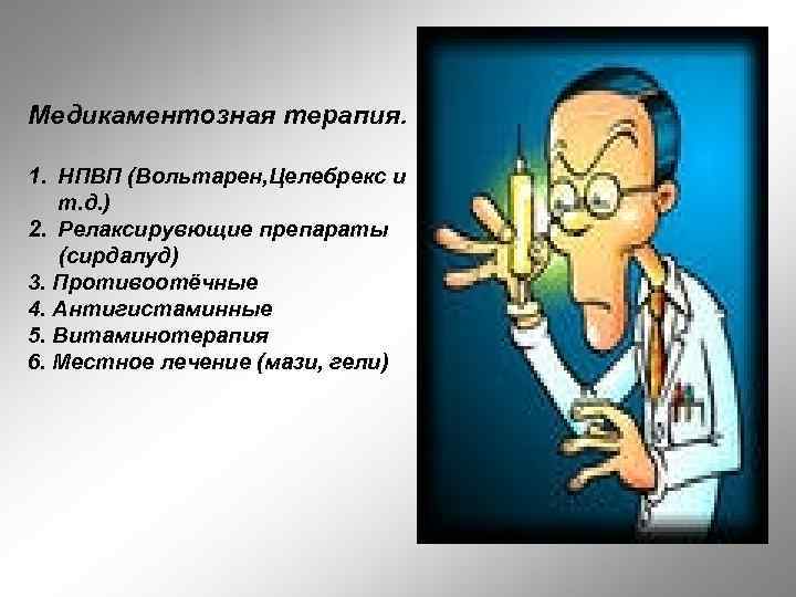 Медикаментозная терапия. 1. НПВП (Вольтарен, Целебрекс и т. д. ) 2. Релаксирувющие препараты (сирдалуд) 3. Противоотёчные 4. Антигистаминные 5. Витаминотерапия 6. Местное лечение (мази, гели)
