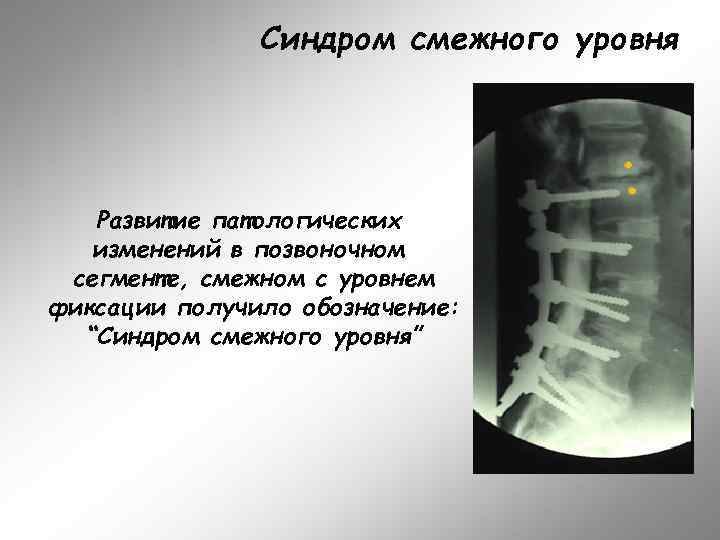 Синдром смежного уровня Развитие патологических изменений в позвоночном сегменте, смежном с уровнем фиксации получило обозначение: “Cиндром смежного уровня”
