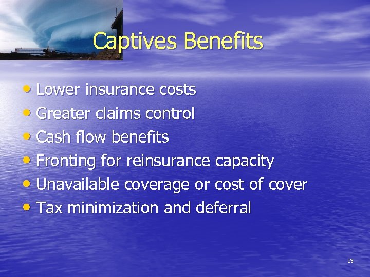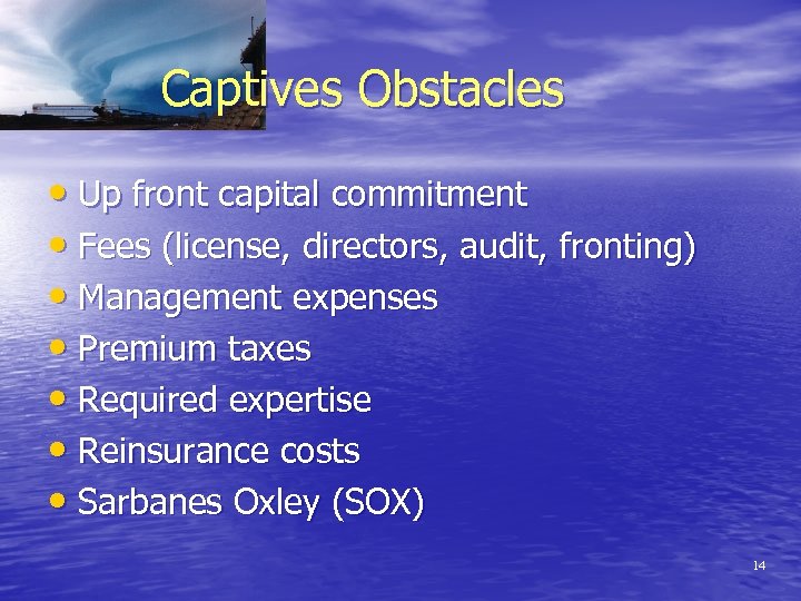 Captives Benefits • Lower insurance costs • Greater claims control • Cash flow benefits • Fronting for reinsurance capacity • Unavailable coverage or cost of cover • Tax minimization and deferral 13