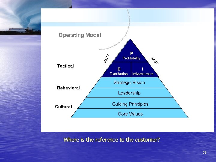 Operating Model ST P FA ST Tactical FA Profitability D I Distribution Infrastructure Strategic Vision Behavioral Leadership Cultural Guiding Principles Core Values Where is the reference to the customer? 23