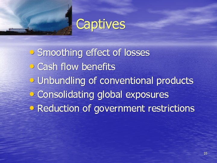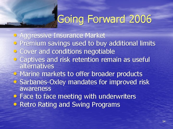 Going Forward 2006 • Aggressive Insurance Market • Premium savings used to buy additional limits • Cover and conditions negotiable • Captives and risk retention remain as useful • • alternatives Marine markets to offer broader products Sarbanes-Oxley mandates for improved risk awareness Face to face meeting with underwriters Retro Rating and Swing Programs 24