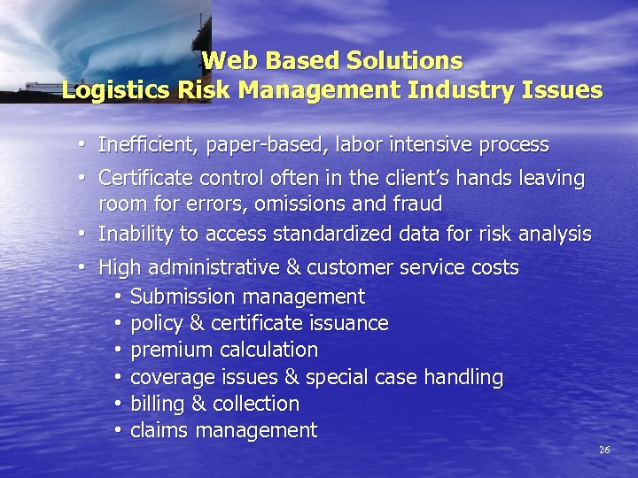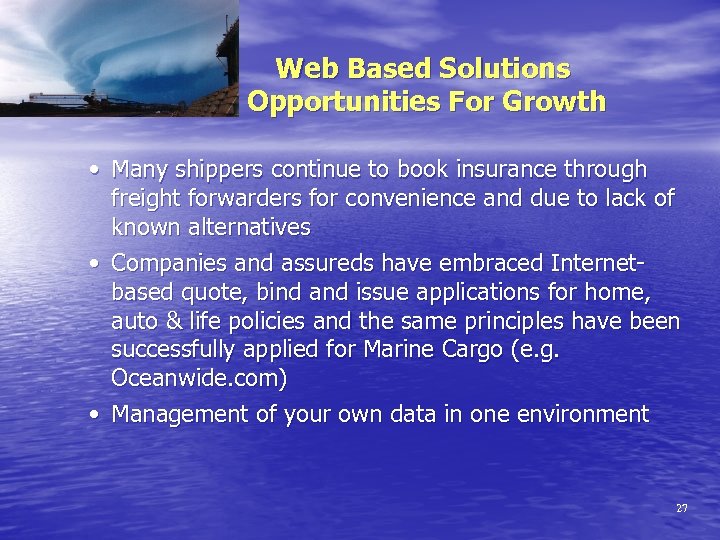 Web Based Solutions Logistics Risk Management Industry Issues • Inefficient, paper-based, labor intensive process • Certificate control often in the client’s hands leaving room for errors, omissions and fraud • Inability to access standardized data for risk analysis • High administrative & customer service costs • Submission management • policy & certificate issuance • premium calculation • coverage issues & special case handling • billing & collection • claims management 26