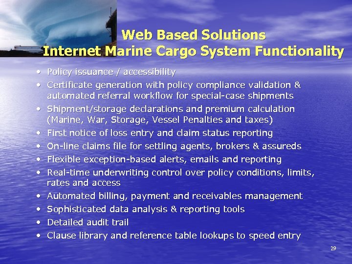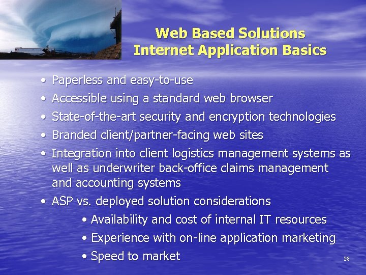 Web Based Solutions Opportunities For Growth • Many shippers continue to book insurance through freight forwarders for convenience and due to lack of known alternatives • Companies and assureds have embraced Internetbased quote, bind and issue applications for home, auto & life policies and the same principles have been successfully applied for Marine Cargo (e. g. Oceanwide. com) • Management of your own data in one environment 27